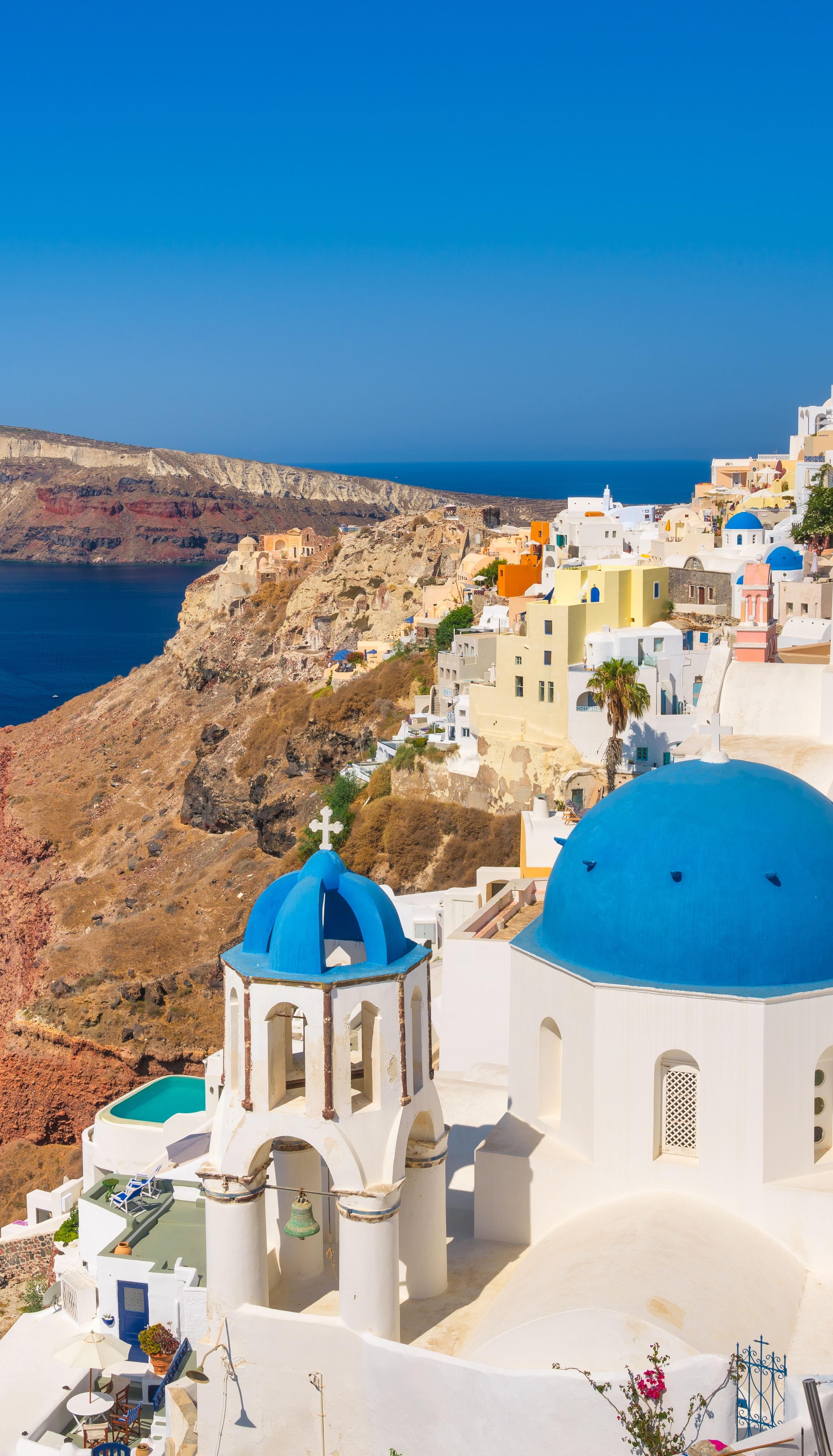 Die wichtigsten Dörfer Santorins liegen an den steilen Klippen der Caldera im Westen der Insel. Das Bild der weiß getünchten Häuser, die in schwindelerregender Höhe in den Felsen nisten und die ganze Flanke der Klippe überziehen, ist weltweit bekannt. Schwindelerregend steil stürzen die Klippen bis zu 700 Meter tief zum Meer hinab und bieten atemberaubende Ausblicke auf die Weite der Ägäis. Ebenso beeindruckend ist die Ansicht vom Meer aus auf die Insel selbst.